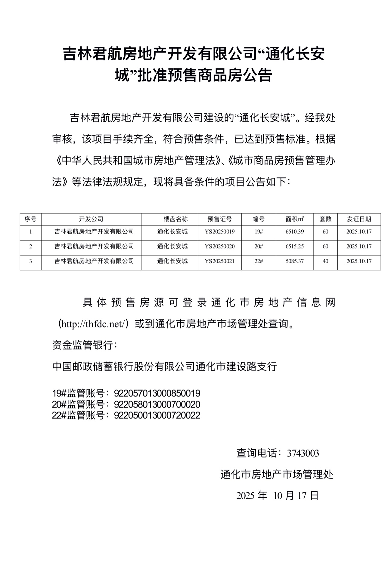 吉林君航房地产开发有限公司“通化长安城”批准预售商品房公告