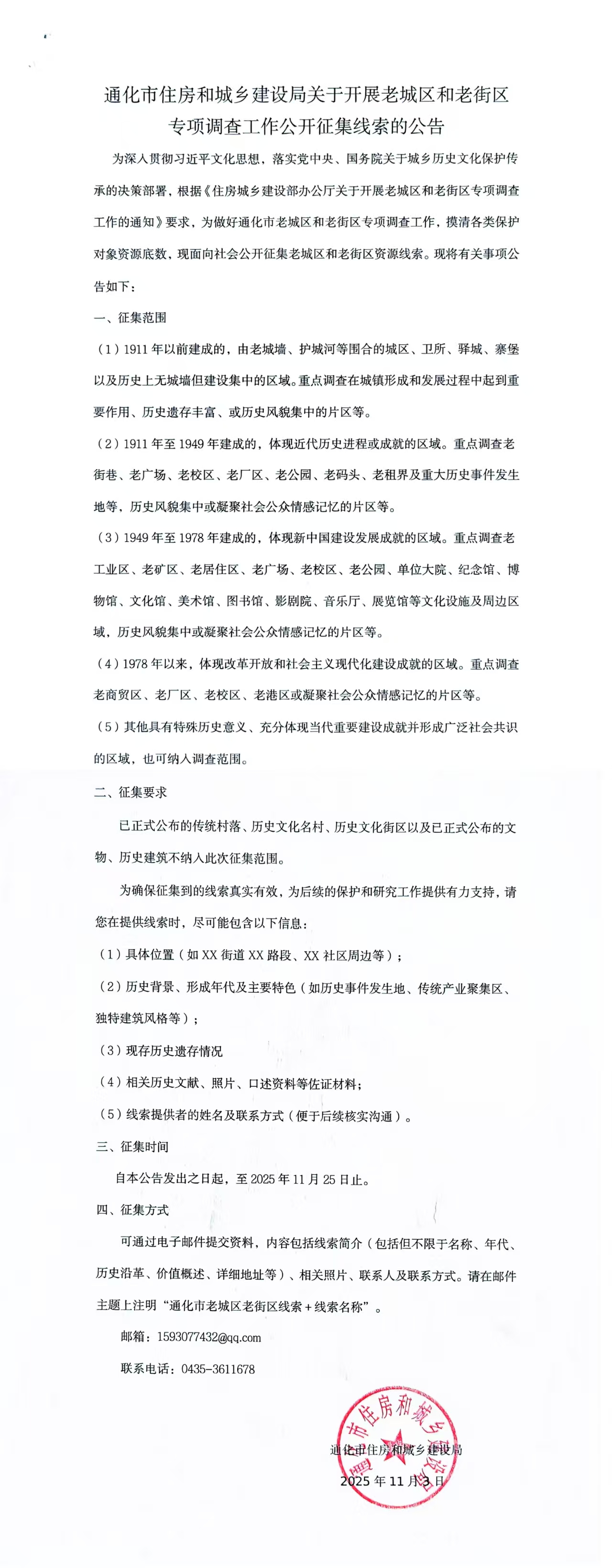 通化市住房和城乡建设局关于开展老城区和老街区专项调查工作公开征集线索的公告
