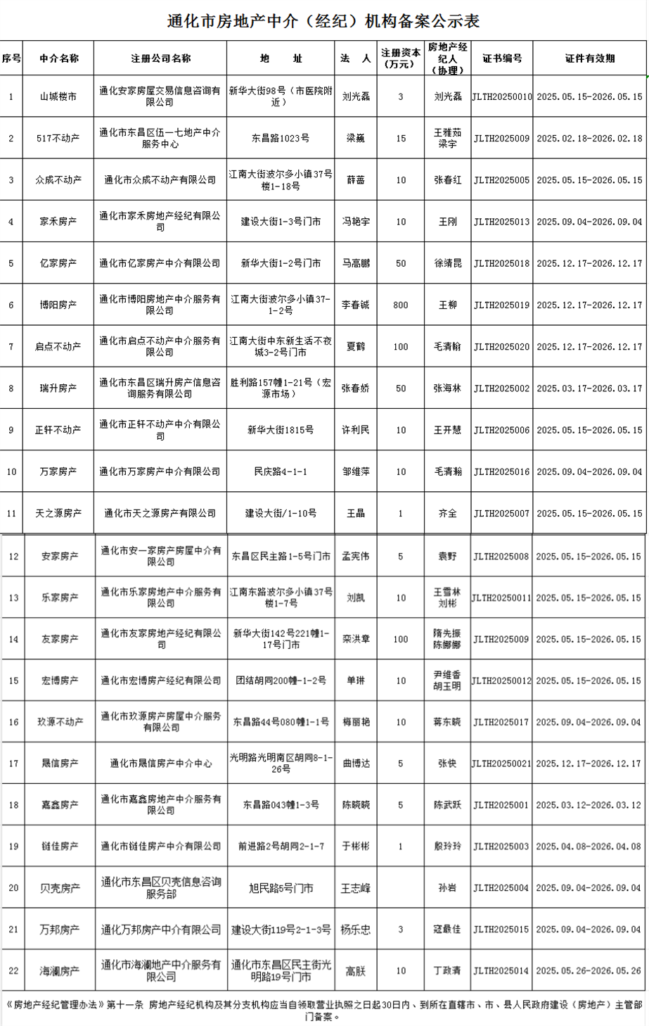 通化市房地产中介(经纪)机构备案公示表