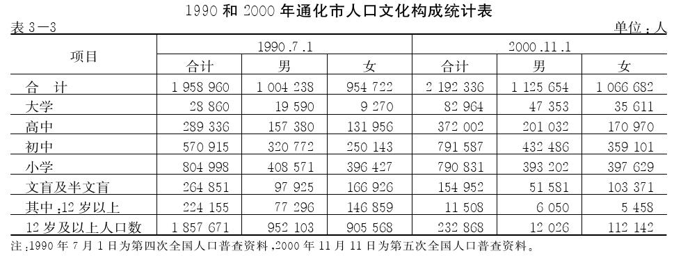 2000年,全国第五次人口普查,通化市有小学以上文化程度的人口2037384人,占6岁及6岁以上(下同)人口的92.93%。其中,接受大学教育的82964人,占3.78%;接受高中教育的372002人,占16.97%;接受初中教育的791587人,占36.11%;接受小学教育的790831人,占36.07%;文盲、半文盲人口占7.07%。市区有小学以上文化程度的人口412317人,占94.21%。其中,接受大学(大专以上)教育的37677人,占8.61%;接受高中(含中专)教育的131042人,占29.94%;接受初中教育的147561人,占33.72%;接受小学教育的96037人,占21.94%;文盲、半文盲人口占5.79%。是年,有小学以上文化程度的男性为1074073人,女性为963311人,男女比重为52.72:47.28;市区有小学以上文化程度的男性为212348人,女性为199969人,男女比重为10.42:9.81。
