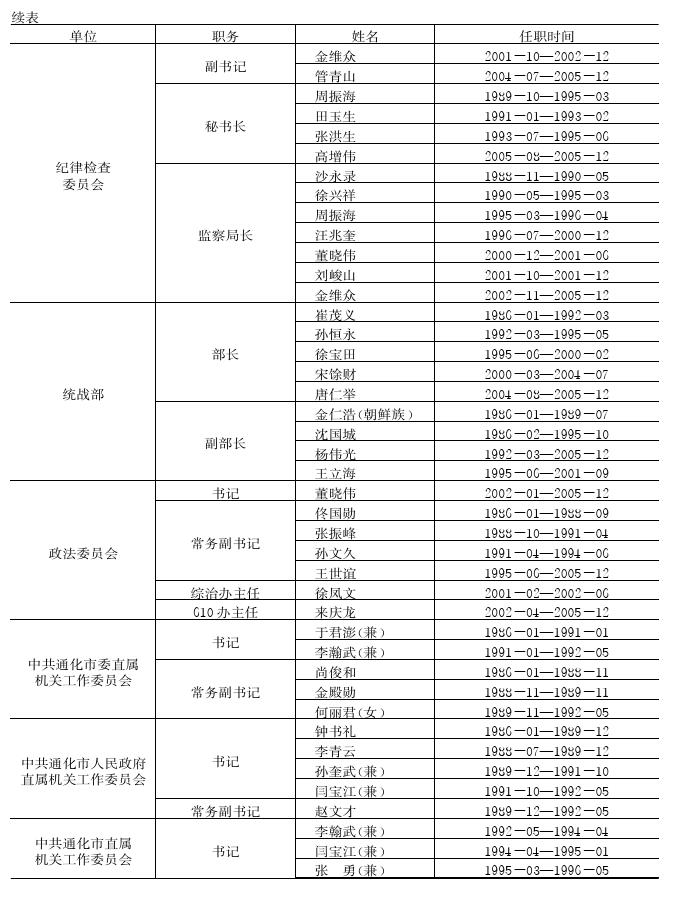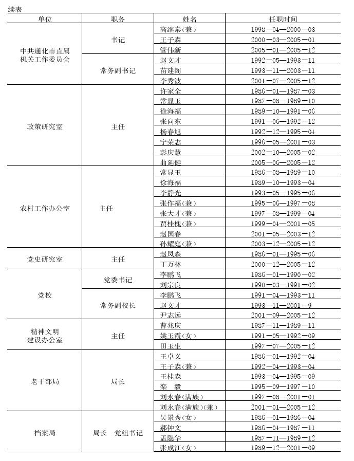 市委办公室 1986年,内设秘书科、综合科、机要科、行政管理科、保卫科、保密委员会办公室、信息科、督查室、房产科,编制30人。8月,保密委员会办公室析出。1989年,增设老干部科,房产科改为市委机关房产处(科级事业单位)。1993年9月,行政管理科、保卫科、老干部科划出机关,组建市委办公室机关服务处(科级事业单位)。1995年8月,撤销机要科,组建机要局(与市保密局合署办公,二级局建制),增设人事科,恢复保卫科,代管档案局。编制25人,其中行政编制23人。2001年10月职能调整,将原市委机要保密局职能并入市委办公室,对外保留通化市委机要保密局,增设机要保密局密码通信科、法规监察科,编制31人。其中,行政编制28人,工勤事业编制3人,至2005年。