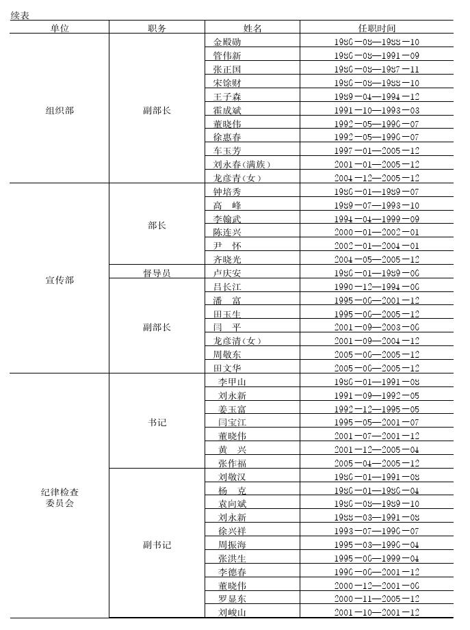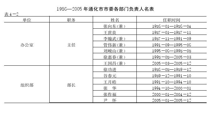 市委组织部 负责管理组织工作和干部工作的职能部门。1986年,内设秘书科、干部科、青年干部科、干部教育科、组织科、干部审查科、党员管理科,编制37人。4月,撤销党员管理科,成立市委组织员办公室,增设调查研究科,代管市委老干部局。1991年,调查研究科改为研究室,增设党员电化教育中心。1992年至1996年,撤销秘书科、青年干部科,增设综合干部科、办公室、经济干部科、知识分子办公室、党政干部科、干部人事档案室。2001年,内设办公室、研究室、干部一科、干部二科、干部三科、干部教育科、干部监督科、组织一科、组织二科(加挂企业工委办公室)、组织三科,编制34人。2004年,干部监督科改为干部监督办公室,成立人才工作办公室,编制38人,至2005年。
