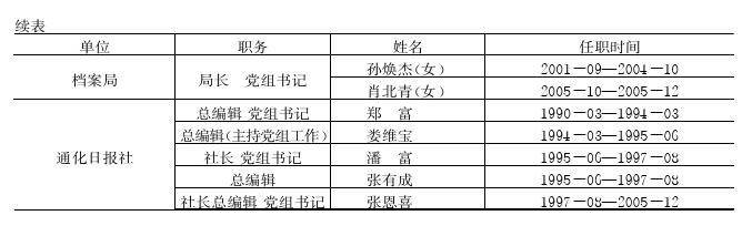 党史研究室 1986年,市党史资料征集研究室和地方志编纂办公室(简称史志办)合署办公,副县级建制。1987年5月,史志办改称为市委史志工作委员会,县级建制,对外保留党史资料征集研究室牌子。是年,内设秘书科、党史科、方志编审科,编制17人。1990年11月,撤销史志工作委员会,党史研究与地方志编纂机构分设,成立市委党史研究室。是年,内设综合科、编研科,编制9人。2001年,业务范围在原有的地方党史资料征集、研究、编写基础上,增加4项职能,即党史宣传教育、对县(市、区)业务指导、审查党史内容出版物、开展党的领袖以及党史重要人物纪念活动。是年,内设征研一科、征研二科,编制9人。2003年,成立“通化市党史宣传教育中心”,主要为各级党组织开展党史宣传教育提供教材、书刊及影视资料,主办或协助有关部门组织报告会、论坛、党史知识竞赛,组织或参加重要党史人物纪念活动,承办重大题材的党史展览、影视作品策划制作等。2005年,内设机构、编制未变。
