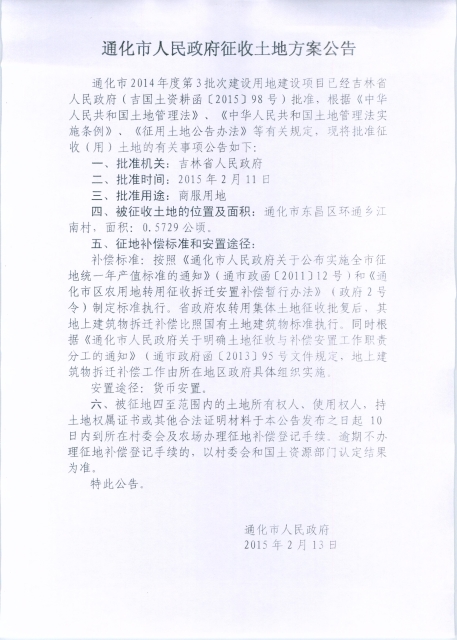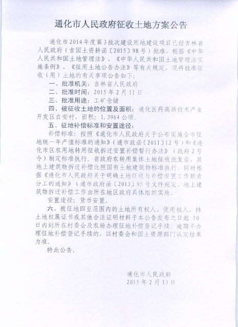 通化市人民政府2014年第3批次用地