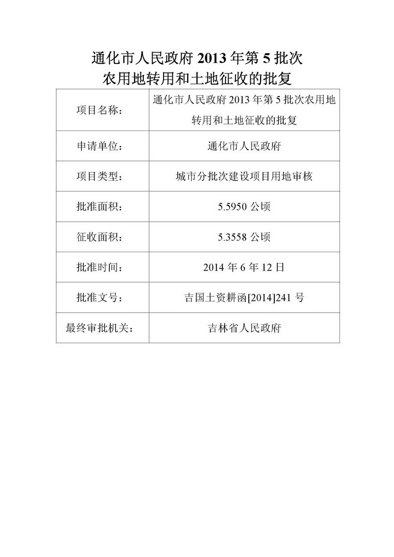 通化市人民政府2013年第5批次农用地转用和土地征收的批复