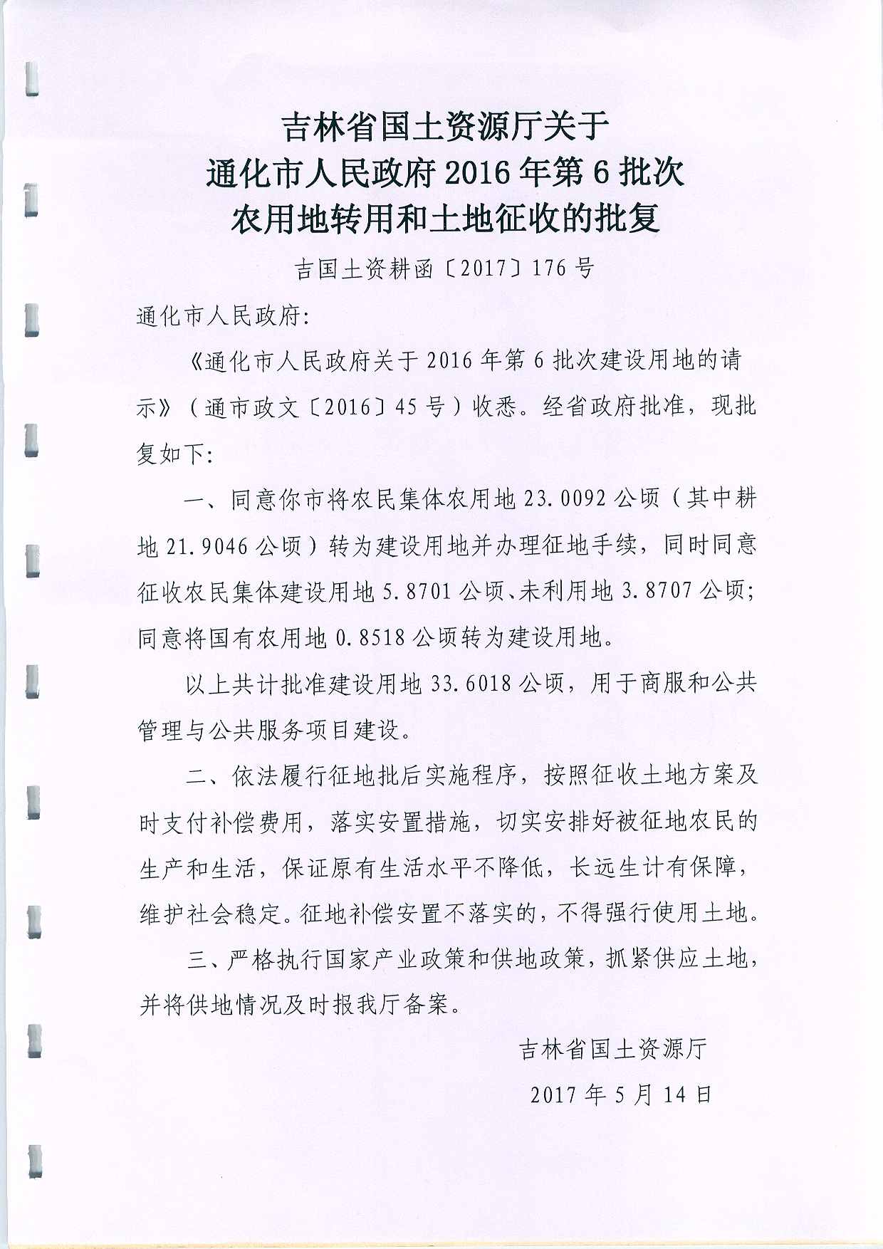 通化市政府2016年第6第批次农用地转用和土地征收的批复