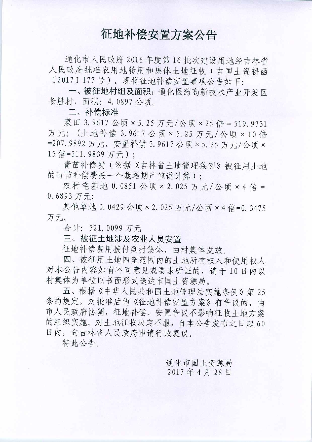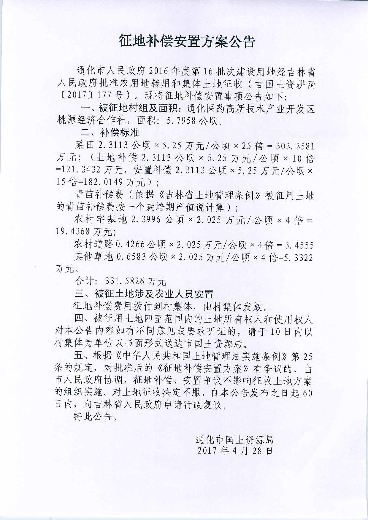 通化市政府2016年第16批次征地补偿安置方案公告2