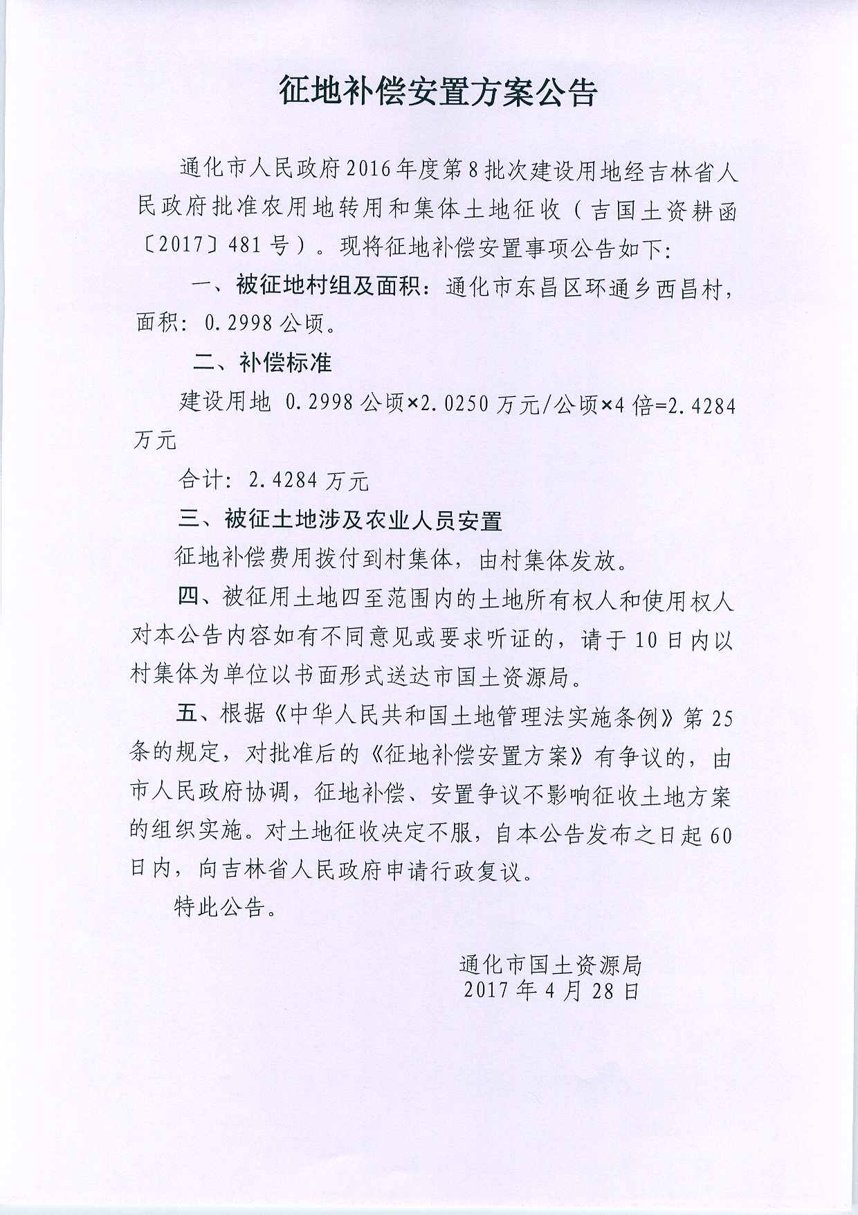 通化市2016年第8批次征地补偿安置方案公告