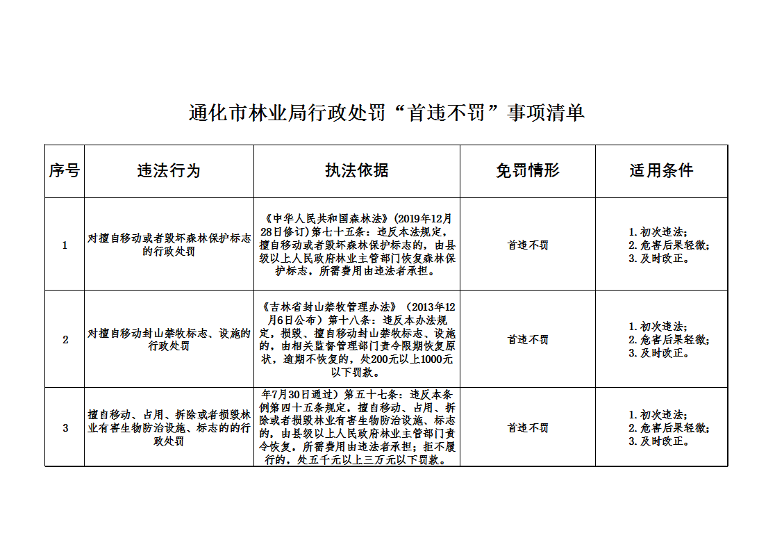 通化市林业局行政处罚“首违不罚”事项清单
