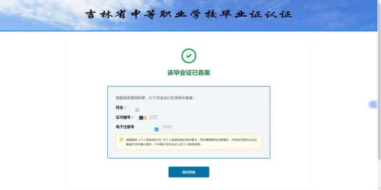 1.中专学历的考生除毕业证书外还需登录吉林中专认证网https://renzheng.jlipedu.cn/,打印最新查询的毕业证备案状态页面截图。(自2026年1月1日起,根据国家《个人信息保护法》对个人敏感信息的保护要求,同时兼顾查询的便捷性,本系统仅提供毕业证备案状态的确认服务,不会展示您毕业证上的个人敏感信息),具体样式如下,无法查询到的考生需提供学校的花名册(入学名录和毕业名录)、学籍档案、学校出具的相关证明等。