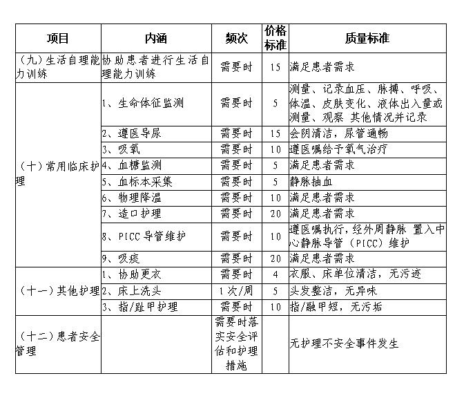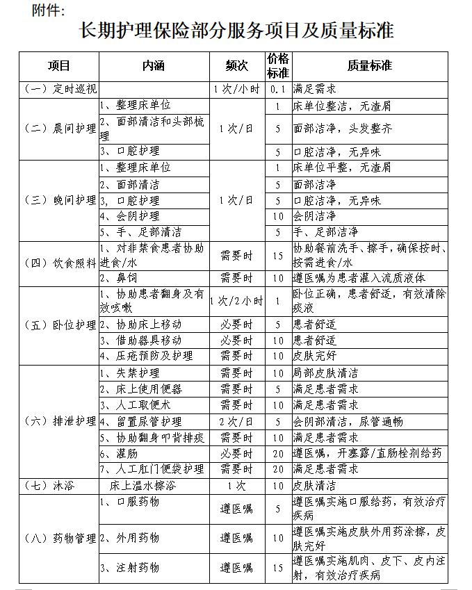 3.支付范围。长期护理保险基金支付范围为失能人员发生的基本生活照料和与基本生活密切相关的医疗护理等费用,包括符合规定的床位费(限在养老或护理机构接受照护期间,医疗机构、居家护理除外)、护工劳务费、护理设备使用费、舒缓治疗费、护理生活日用品费用等。试点阶段,长护保险失能人员支付项目参照《长期护理保险失能人员部分服务项目及质量标准》(见附件)执行。应由医疗(生育)保险、工伤保险等其他基金支付的费用,由相应基金按规定支付,应由第三方支付的费用,长期护理保险基金不予支付。