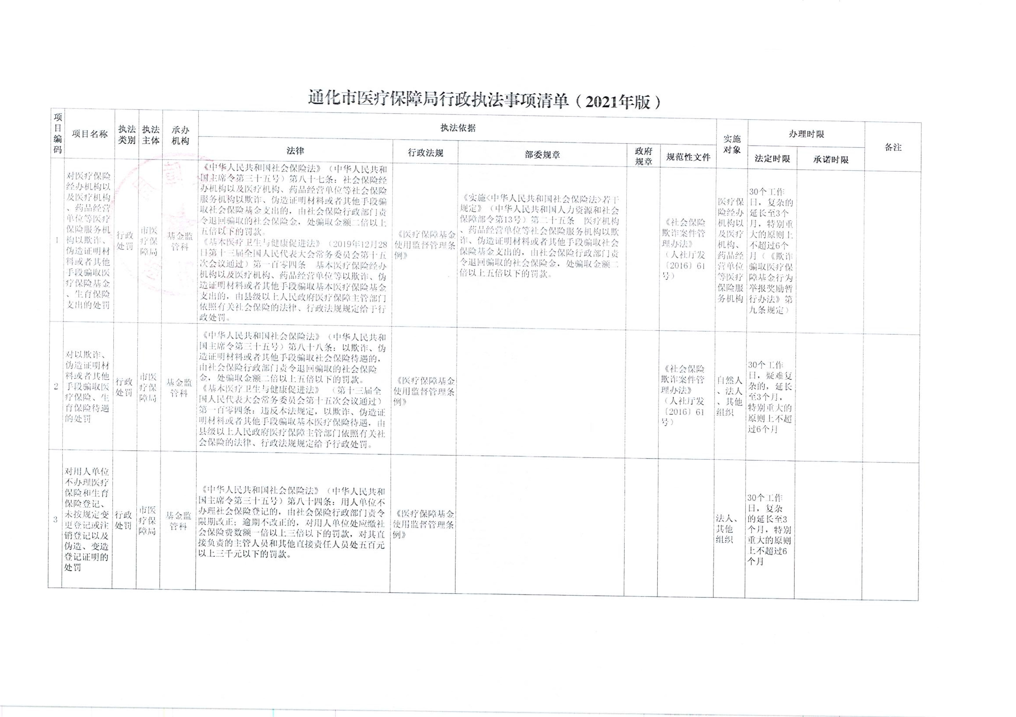 根据《吉林省医疗保障局权责事项清单(试行)》(吉医保发〔2021〕13号)文件精神,经市医疗保障局2021年第15次局长办公会研究,重新制定《通化市医疗保障局行政执法事项清单(2021年版)》,现印发给你们,请局机关各科室、所属单位遵照执行,各县(市)医疗保障局结合本地实际,参照执行。