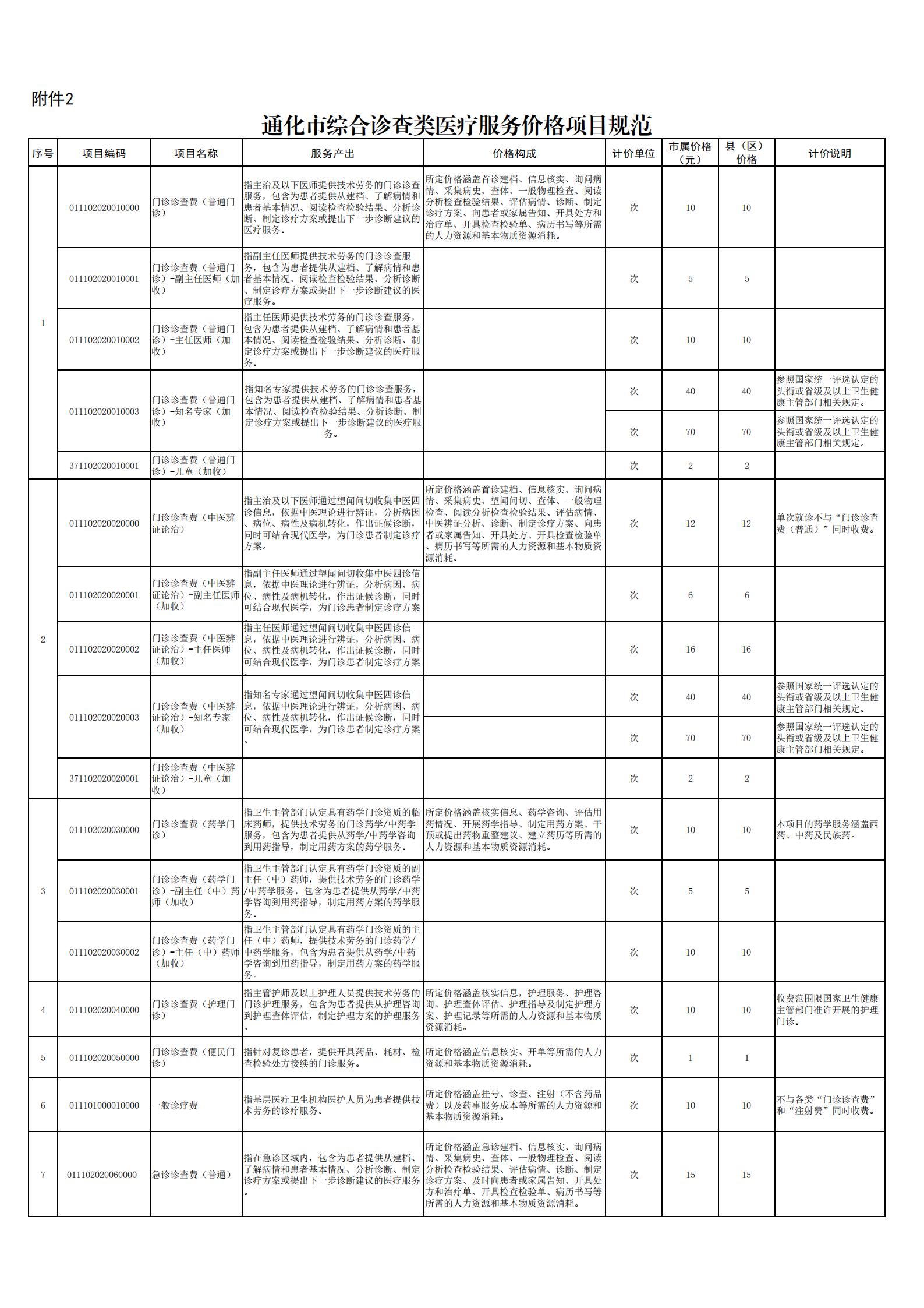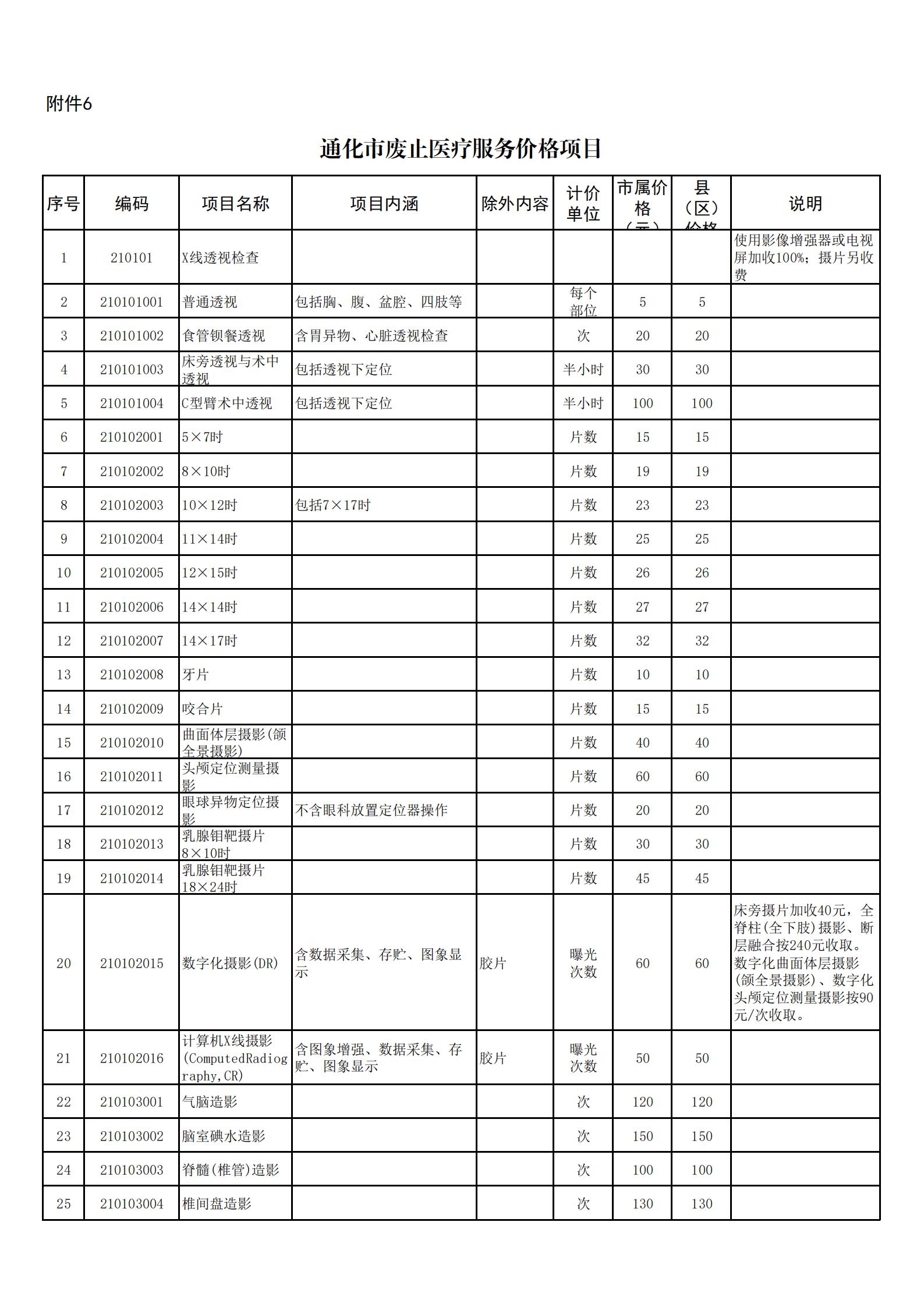 根据省医保局、卫健委《关于规范医疗服务价格项目的通知》(吉医保联〔2025〕15号),现将我市公立医疗机构放射检查类、综合诊查类、中医骨伤类、中医特殊疗法类和透析相关医疗服务价格项目印发给你们,请遵照执行。