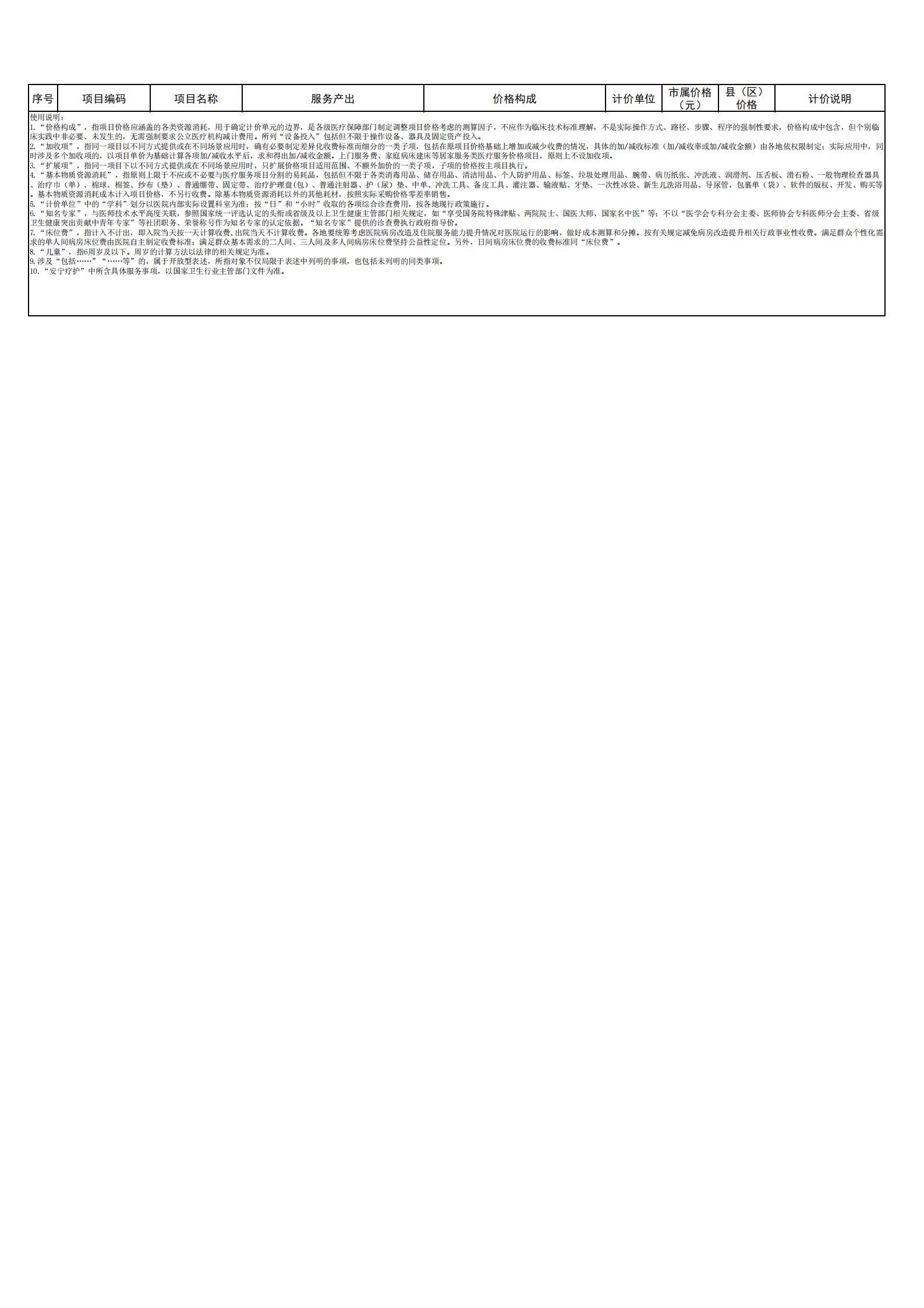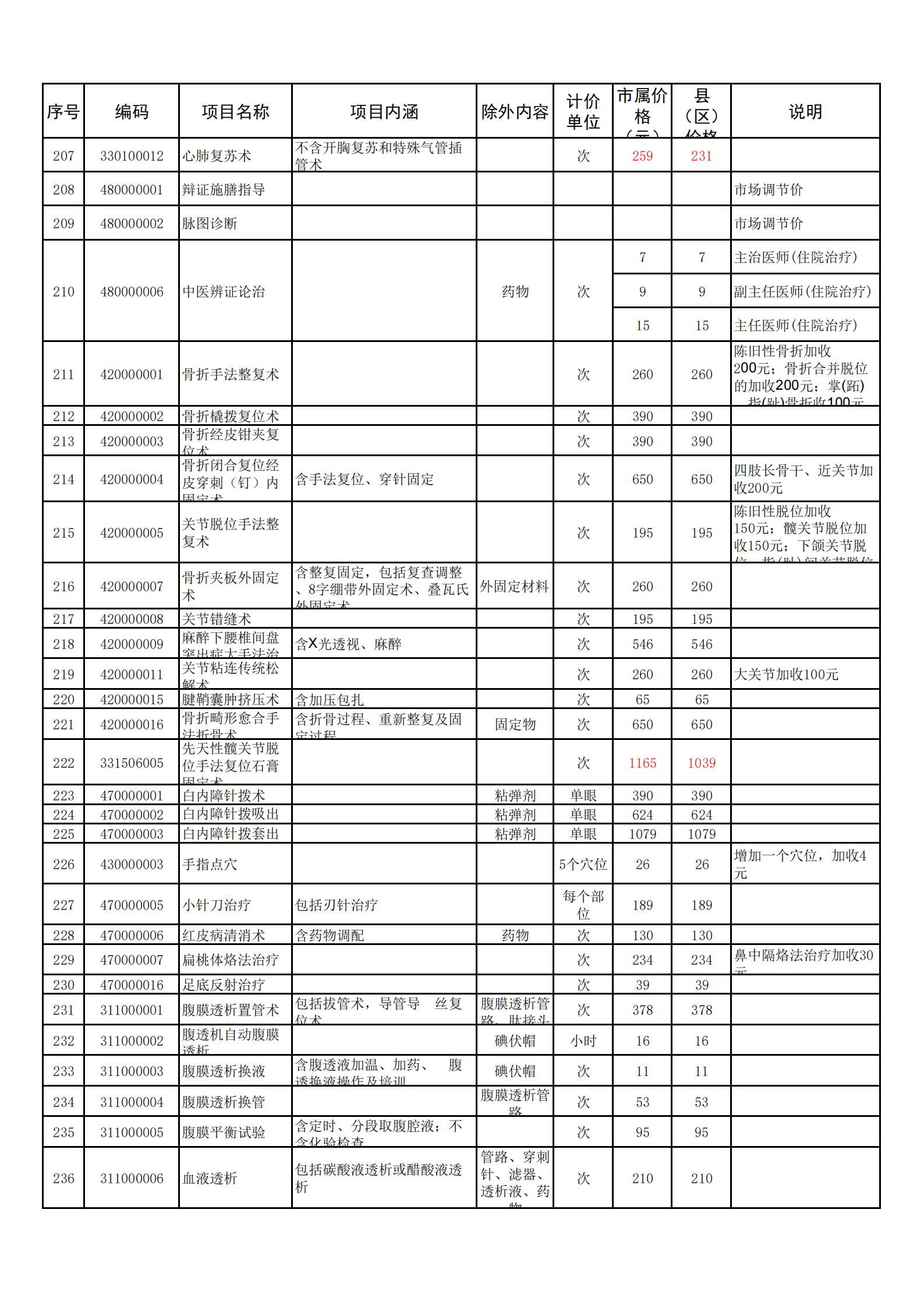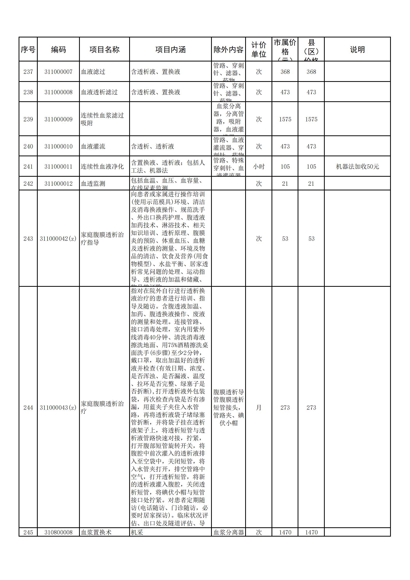 本次规范医疗服务价格项目343项。其中,新设放射检查类医疗服务价格项目26项(详见附件1)、综合诊查类医疗服务价格项目36项(详见附件2)、中医骨伤类医疗服务价格项目9项(详见附件3)、中医特殊疗法类医疗服务价格项目6项(详见附件4)、透析相关医疗服务价格项21项(详见附件5),废止245项医疗服务价格项目(详见附件6)。