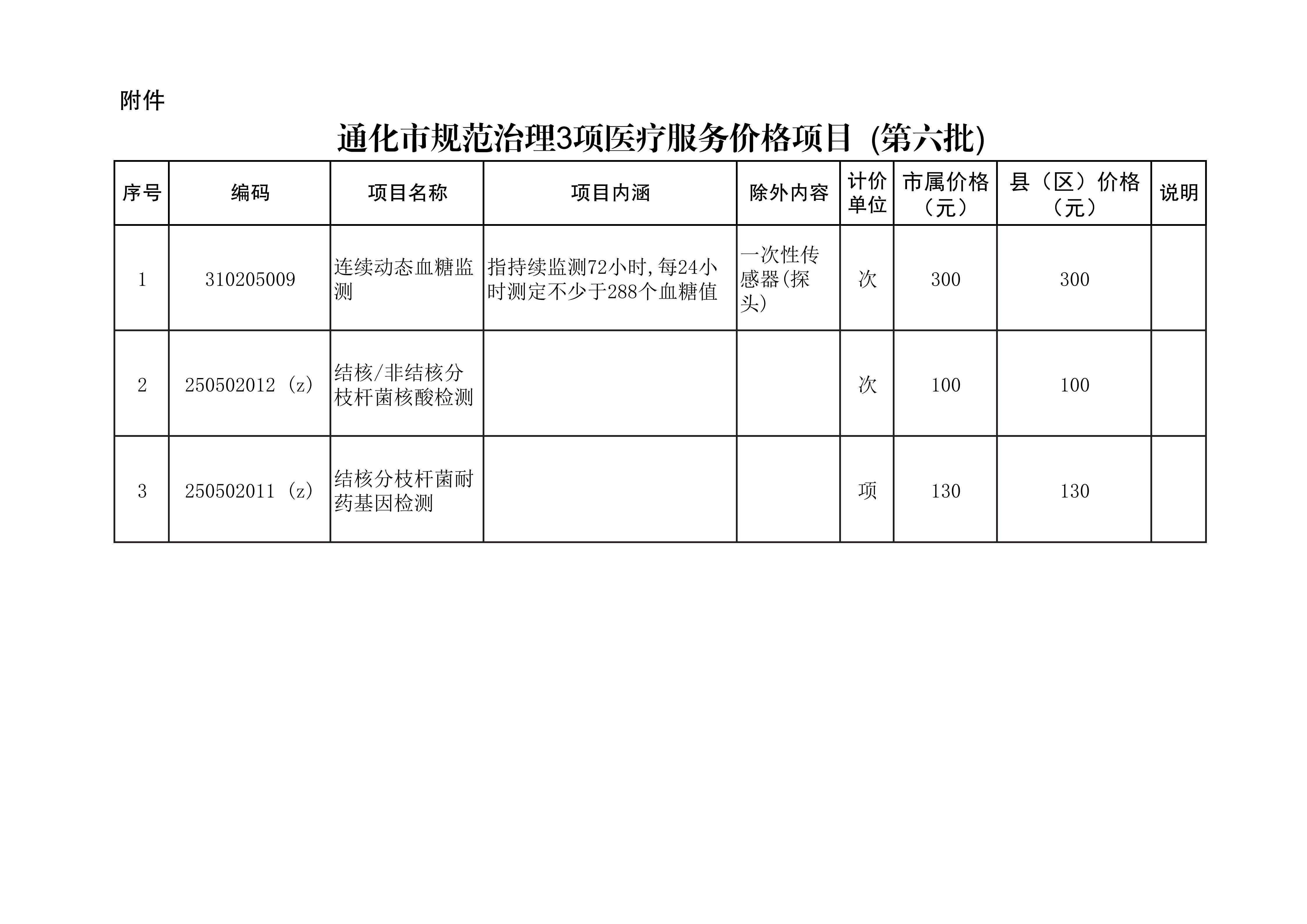 本次规范医疗服务价格项目(第六批)为:连续动态血糖监测、结核/非结核分枝杆菌核酸检测、结核分枝杆菌耐药基因检测3个项目(详见附件)。