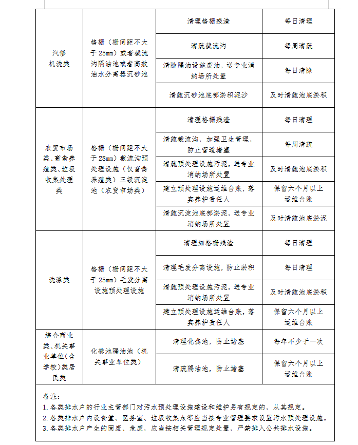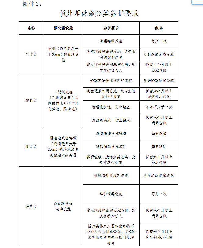 第十条 各类排水户应当按照国家和地方相关标准、规范设置隔油池、隔渣池、格栅、三级沉淀池等污水预处理设施。具体设置要求详见附件《预处理设施分类养护要求》。