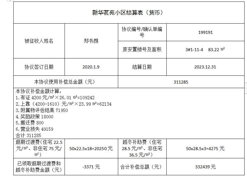 被征收房屋安置补偿总额确认单金额-被征收人已领取金额+需支付的过渡费和越冬补助费的总额=货币补偿总额共计332439元。
