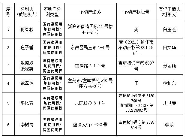 根据《不动产登记暂行条例实施细则》第十四条的规定,经初步查验,不动产登记机构拟对下列不动产权利办理不动产继承登记。根据《不动产登记暂行条例实施细则》第十七条的规定,现予公告。如有异议,请自本公告之日起15个工作日内,将异议书面材料送达不动产登记机构。逾期无人提出异议或者异议不成立的,不动产登记机构将予以登记。