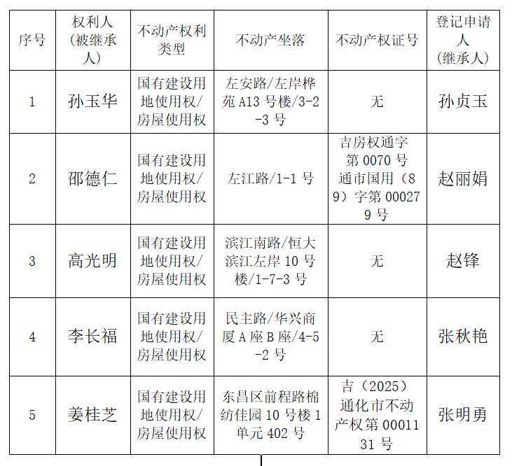 根据《不动产登记暂行条例实施细则》第十四条的规定,经初步查验,不动产登记机构拟对下列不动产权利办理不动产继承登记。根据《不动产登记暂行条例实施细则》第十七条的规定,现予公告。如有异议,请自本公告之日起15个工作日内,将异议书面材料送达不动产登记机构。逾期无人提出异议或者异议不成立的,不动产登记机构将予以登记。