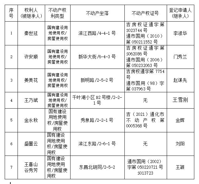 根据《不动产登记暂行条例实施细则》第十四条的规定,经初步查验,不动产登记机构拟对下列不动产权利办理不动产继承登记。根据《不动产登记暂行条例实施细则》第十七条的规定,现予公告。如有异议,请自本公告之日起15个工作日内,将异议书面材料送达不动产登记机构。逾期无人提出异议或者异议不成立的,不动产登记机构将予以登记。