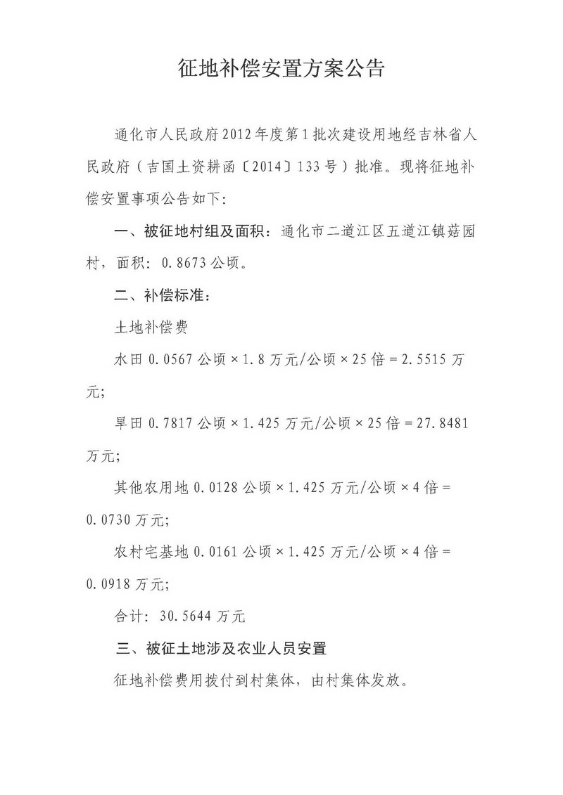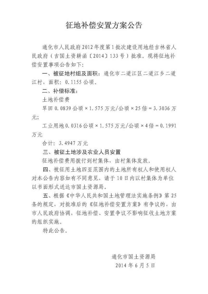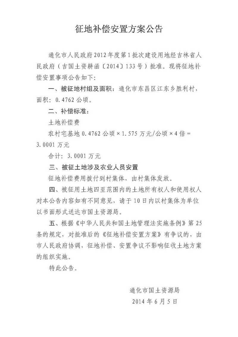 通化市人民政府2012年度第1批次建设用征地补偿安置方案公告