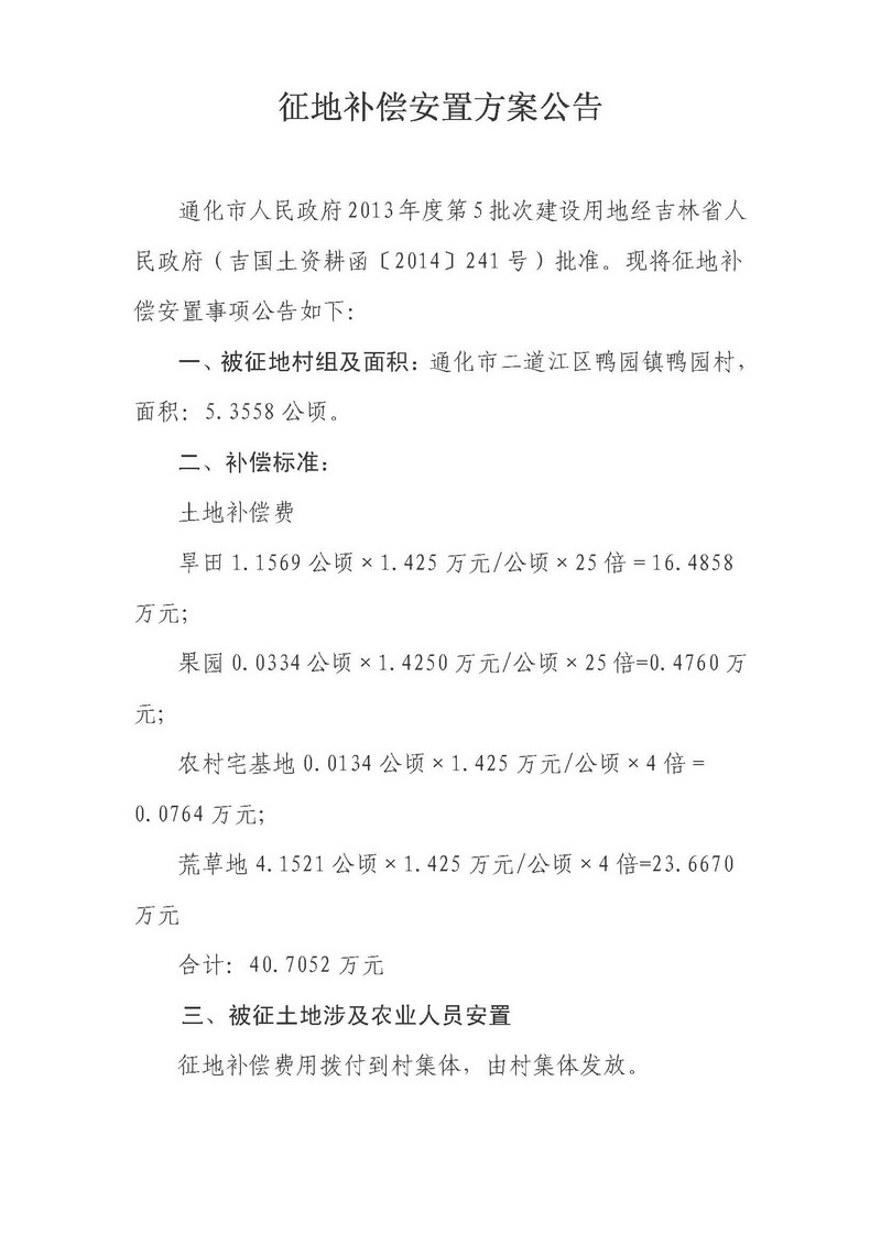 通化市人民政府2013年度第5批次建设用地征地补偿安置方案公告