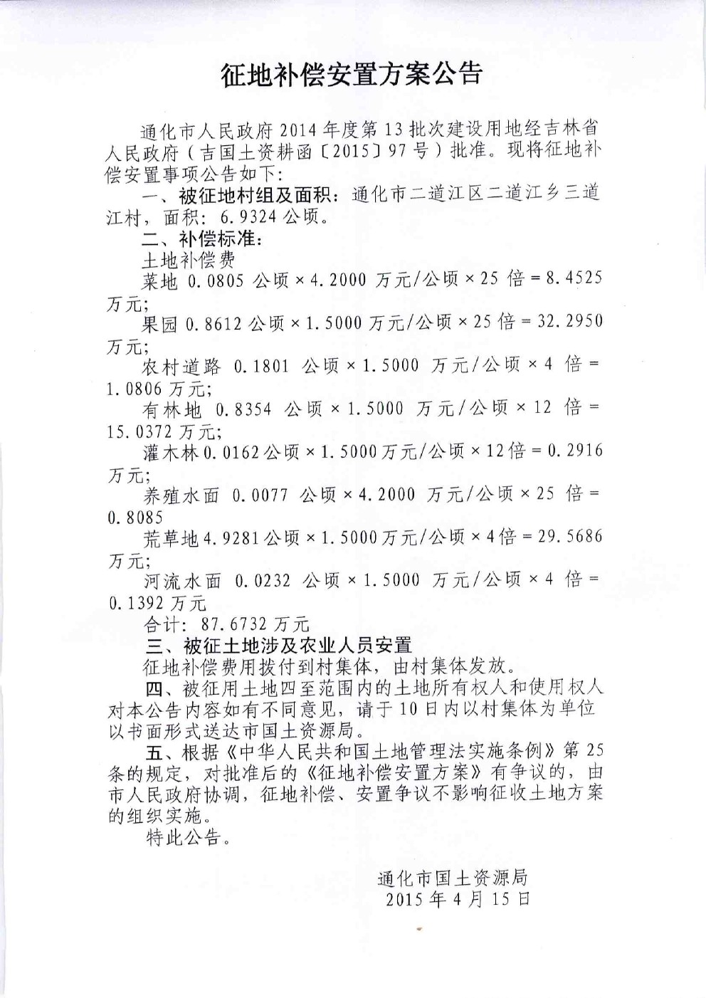 通化市人民政府2014年度第13批次建设用地征地补偿安置方案公告