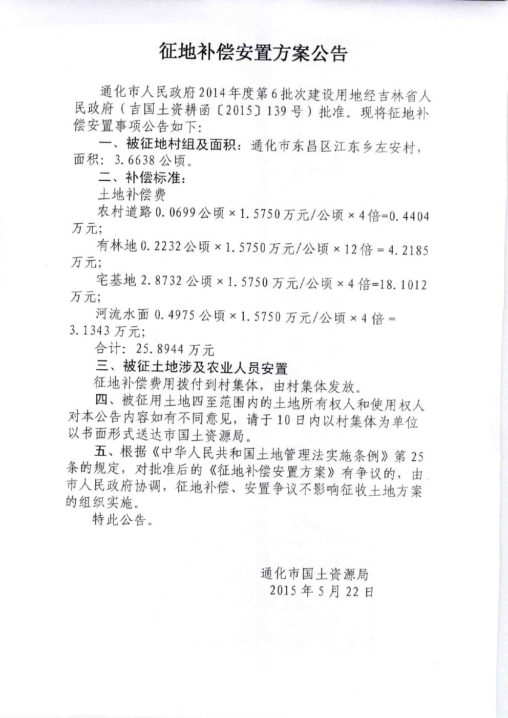 通化市人民政府2014年度第6批次建设用地征地补偿安置方案公告