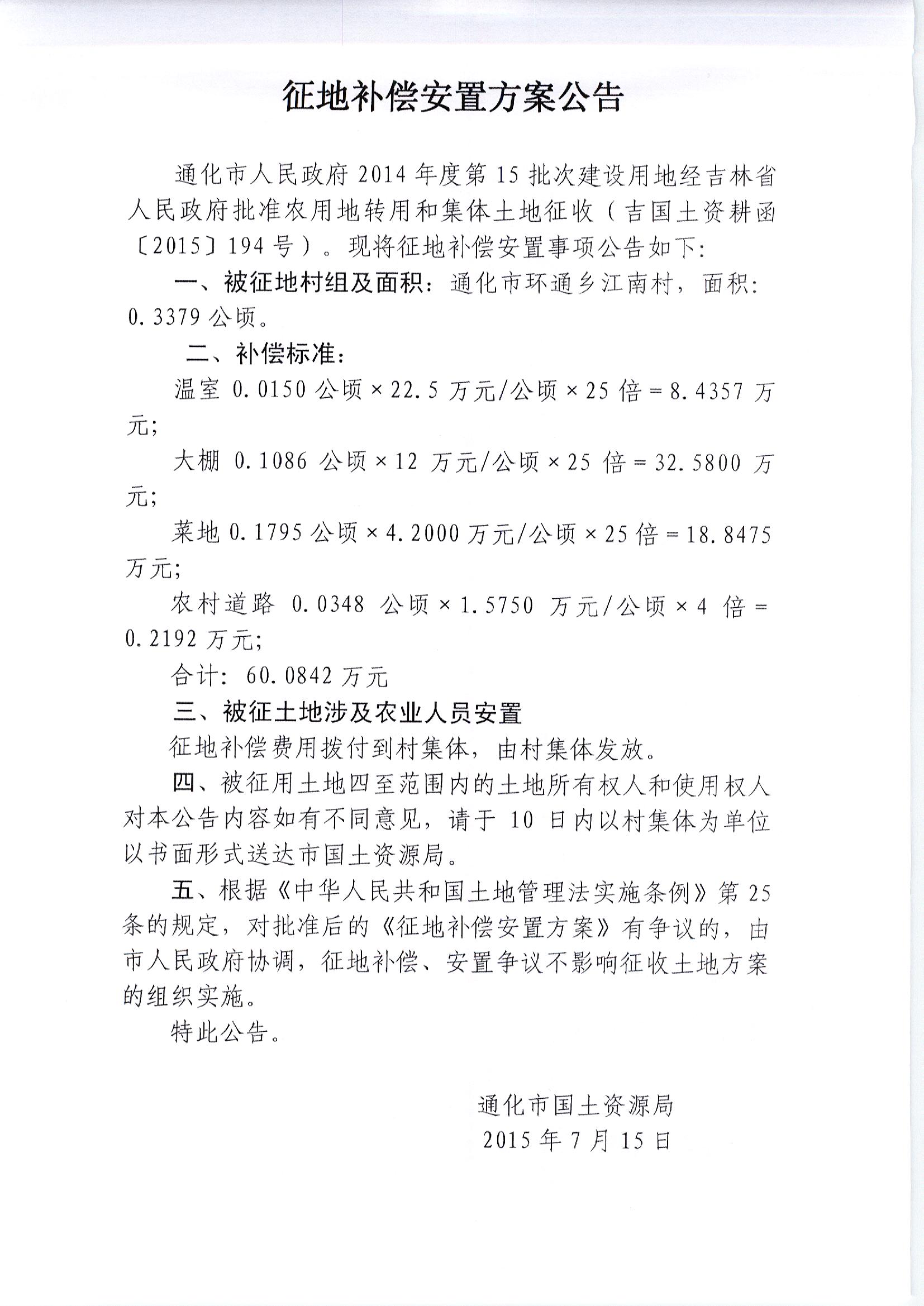 通化市人民政府2014年度第15批次建设用地征地补偿安置方案公告