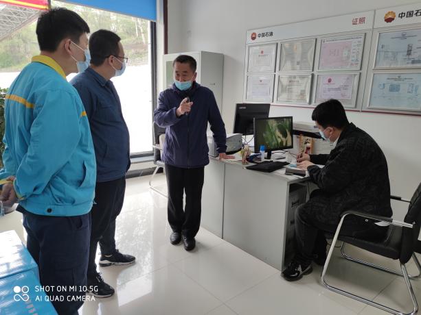 图为:工作人员讲述如何开展自行监测 图为:在柳河加油站指导危废间建设