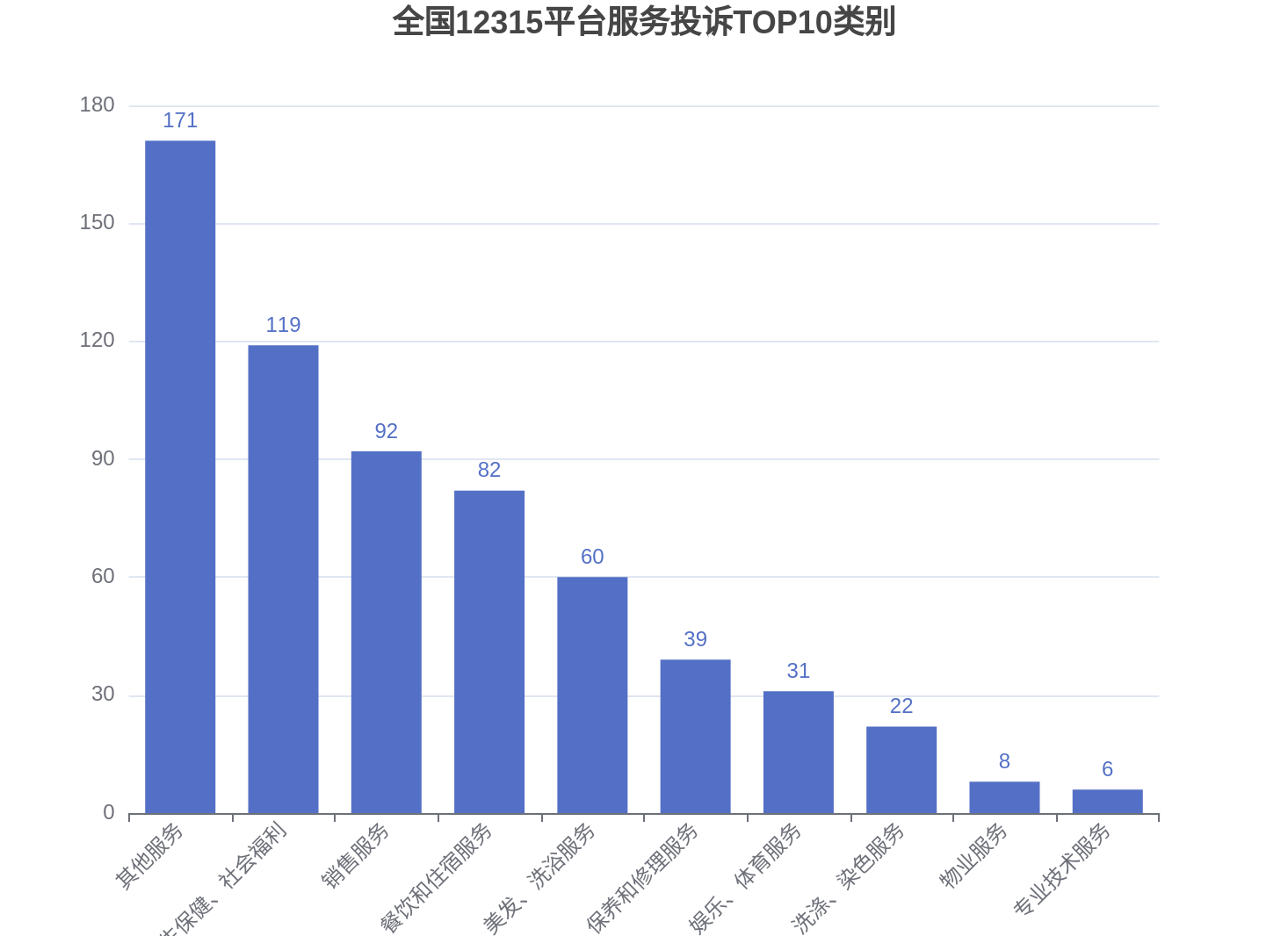 (三)从服务投诉来看,投诉受理量较大的服务主要有:其他服务(171件)、卫生保健、社会福利(119件)、销售服务(92件)、餐饮和住宿服务(82件),合计占比71.71%。增长较快的服务有专业技术服务(上升500%)、销售服务(上升196.77%)、其他服务(上升134.25%)、制作、保养和修理服务(上升116.67%)、电信服务(上升100%)。