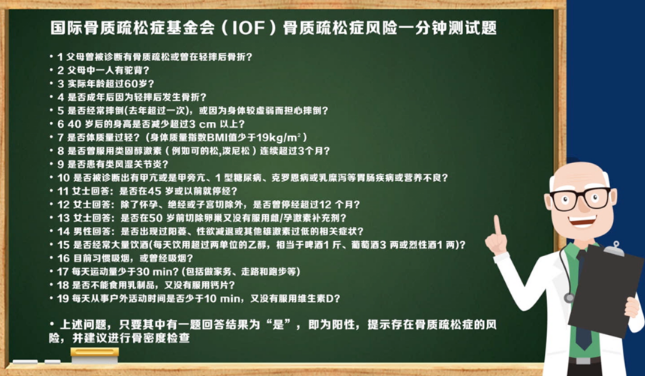 时间:2023-03-13 来源:科普中国 张阿姨与张先生和两个儿子一家四口住在在幸福小区,和乐融融。家里两个儿子小的即将入学,大的已经快要毕业了。过了几十年,好不容易把两个小子拉拔长大,能够独立自主生活,夫妻俩终于可以握着手上的积蓄,追寻遗忘已久的环游中国梦。某天,张阿姨买菜回家经过幸福社区卫生服务中心,看见门上写着提供免费的骨质疏松筛检,于是一个步伐踏入服务中心,报名两个人的筛检。隔日,张阿姨与张先生一起做了筛检,结果张阿姨骨量减少,张先生却正常,这是为什么呢? 调查显示,50岁以上的人群中,女性患骨质疏松症的几率时男性的4倍,骨量减少的几率是男性2倍。此外,女性70岁以后骨质疏松症的发病率增加3倍,男性则80岁以后增加2倍。女性发生骨质疏松症的几率,比其它妇科特有的疾病如乳腺癌、卵巢癌和子宫内膜癌的几率相加还要高。骨质疏松症在男女之间的发病率有如此大的性别差异得归咎于发病的机制。女性绝经后卵巢分泌的雌激素急剧减少,连带使得成骨和破骨的平衡打破。当体内雌激素减少时,破骨细胞数量增加,功能增强,好比拆房工人人数众多,每个人拆房效率极高。另一方面,促进骨形成的成骨细胞无法弥补破骨细胞造成的破坏。因此,在长期的激素水平变化下,只要轻微的外力,譬如蹲下、弯腰、抱小孩,就能造成脆性骨折,也就是“房子塌了”。 绝经后骨质疏松症一般发生在女性绝经后5到10年之间。因为骨质疏松症专挑绝经后女性下手,因此老年女性同胞需要警惕,定时进行骨密度检查。推荐65岁以上女性要定期检查骨密度,男性则为70岁以上。世界卫生组织推荐的骨密度测量法为双能X线法(DXA),其它方法有使用超声骨密度仪、CT等。大部分医院提供的体检套餐不包含骨密度检查,需挂号骨科门诊要求检查。目前对于进行骨密度检查的频率尚未有共识,主要考虑个人的骨质量和第一次的检查结果。由于骨密度变化较慢,因此不需要频繁的进行骨密度检查,一般不多于一年一次。当然,在去医院测骨密度之前,也可以进行一分钟的快速测试,通过回答下述问题来筛查是否有骨质疏松风险。