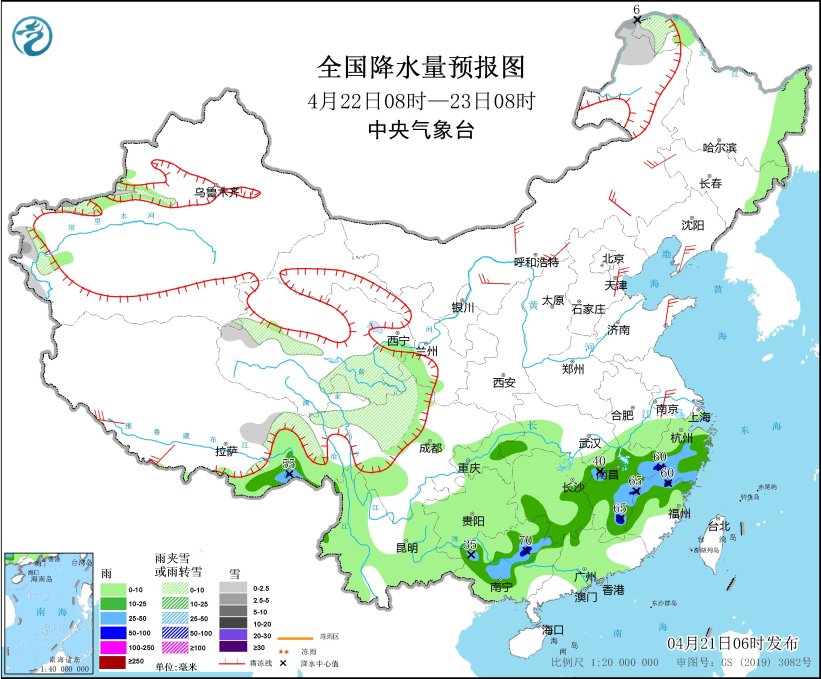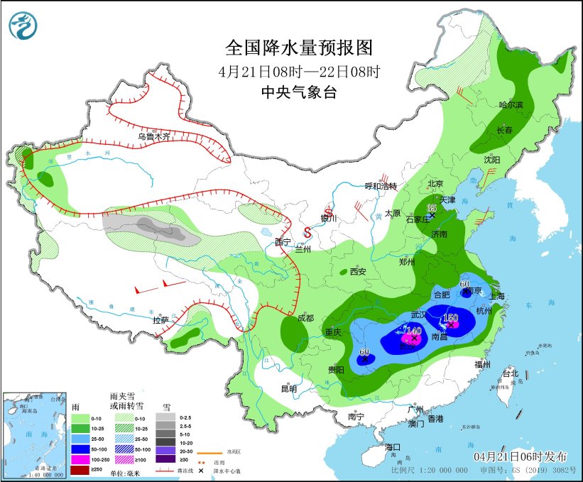 4月21日08时至22日08时,内蒙古东北部、黑龙江西北部、新疆南疆盆地和西部山区、西藏北部、青海北部和西部等地部分地区有小到中雪或雨夹雪。东北地区中部、华北东部、黄淮东部、江淮、江汉、江南大部、华南北部以及四川东南部、重庆、贵州东部等地部分地区有中到大雨,其中,安徽中南部、湖北东北部、湖南中北部、江西北部、浙江中西部、贵州东部等地部分地区有暴雨或大暴雨(100~150毫米)。西藏北部、内蒙古中东部、陕西北部、辽东半岛、山东半岛等地部分地区有5~6级风,阵风7~8级(见图4)。