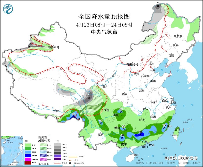 4月23日08时至24日08时,内蒙古东北部、黑龙江西北部、新疆伊犁河谷和南疆西部山区、西藏东部、青海南部和西部、川西高原等地部分地区有小到中雪或雨夹雪,局地有大雪(5~8毫米)。西藏东南部、四川南部、重庆中南部、贵州北部和东南部、云南北部以及江南南部、华南北部等地部分地区有中到大雨,其中,西藏东南部、广西中部和东部、广东西北部等地部分地区有暴雨(50~70毫米)。西藏南部和西部、内蒙古中东部、吉林西部、辽东半岛、陕西北部、河北北部、天津中部、山东半岛等地部分地区有4~5级风(见图6)。