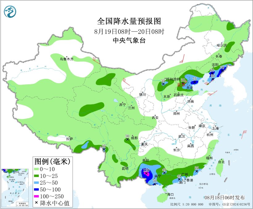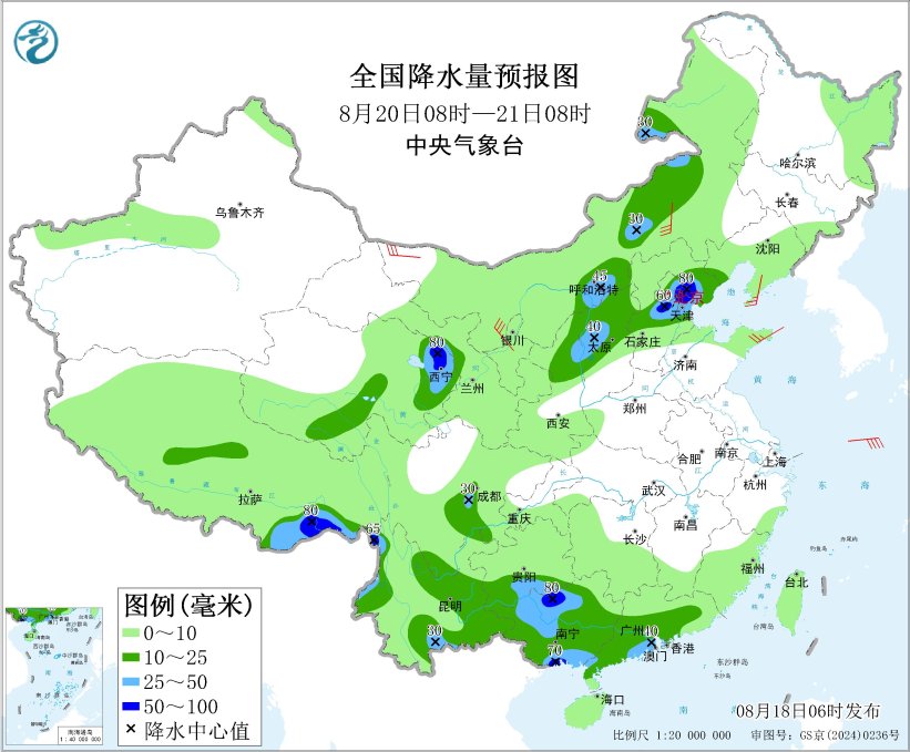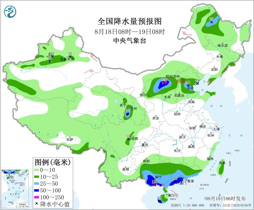 预计,8月18日08时至19日08时,广东南部和西部、广西中南部、海南岛西部以及内蒙古河套地区和东北部、陕西北部、山西北部、北京南部、天津南部、河北东部、甘肃西南部等地部分地区有大到暴雨,其中,内蒙古河套地区、广西南部沿海等地部分地区有大暴雨(100~120毫米)(见图1)。上述部分地区伴有短时强降水(最大小时降雨量20~50毫米,局地可超过70毫米),局地有雷暴大风等强对流天气。中央气象台8月18日06时继续发布暴雨蓝色预警。