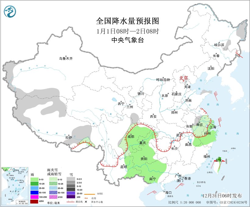 预计,2025年12月31日至2026年1月1日,西藏大部、西北地区东部、华北南部、黄淮西部、江汉、江淮等地有小到中雪或雨夹雪,部分地区大雪或暴雪,其中,江汉、江淮等地雨转雪;西南地区东部、江南、华南等地有小到中雨,局地大雨。