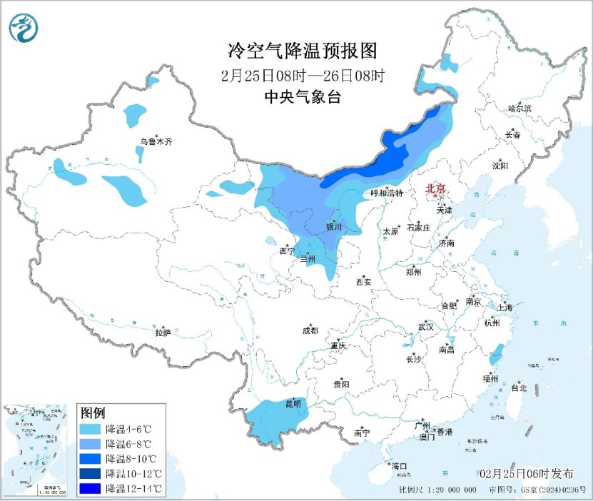 另外,25-26日,受冷空气影响,内蒙古中东部、华北、黄淮、东北地区等地气温将下降4~8℃,其中内蒙古东部、黑龙江、吉林西部等地降温可达10℃以上;上述地区并伴有4~6级偏北风,阵风7~8级,新疆山口地区风力可达10~11级。