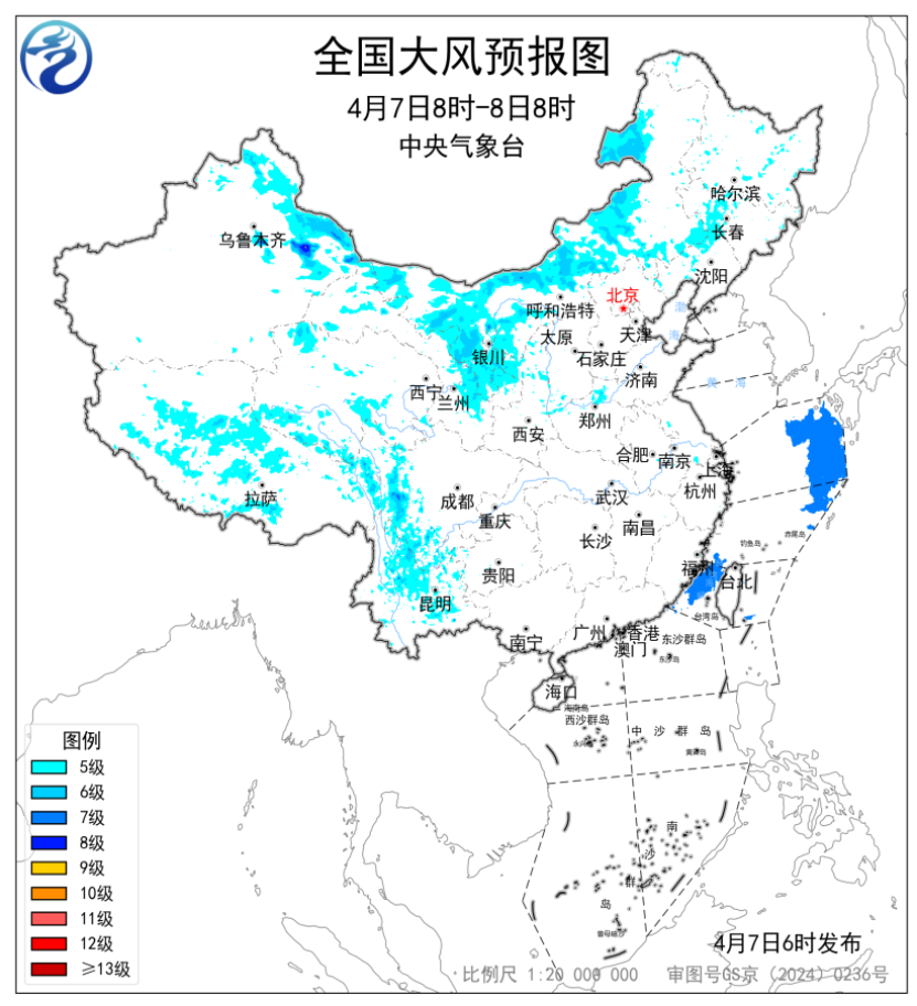 预计未来24小时,新疆东北部、内蒙古、吉林西部、辽宁北部、甘肃东部、宁夏、陕西北部以及西藏、川西高原、云南等地部分地区有5~7级风,阵风7~9级;东海东北部海域、台湾海峡将有7级、阵风8级的风。