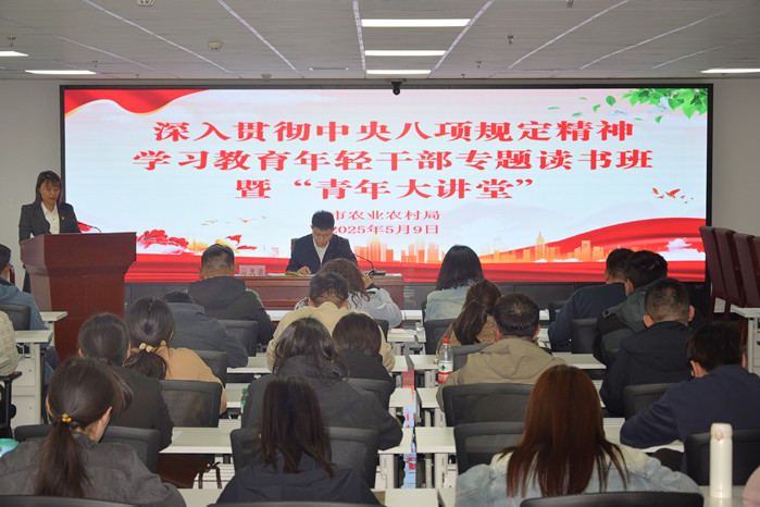 为贯彻落实省委、市委关于突出抓好年轻干部学习教育的部署要求,抓好局系统年轻干部特别是年轻领导干部的学习教育,推动年轻干部以作风建设新成效更好服务农业农村领域高质量发展,5月9日,市农业农村局举办深入贯彻中央八项规定精神学习教育年轻干部专题读书班暨“青年大讲堂”。局党组成员、副局长马天驰主持会议并讲话,局系统60余名年轻干部参加了读书班。此次专题读书班由集中学习、警示教育和研讨交流等3个环节构成。